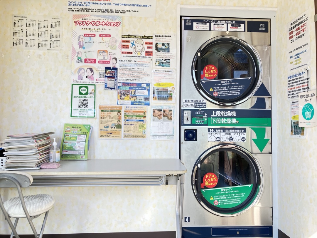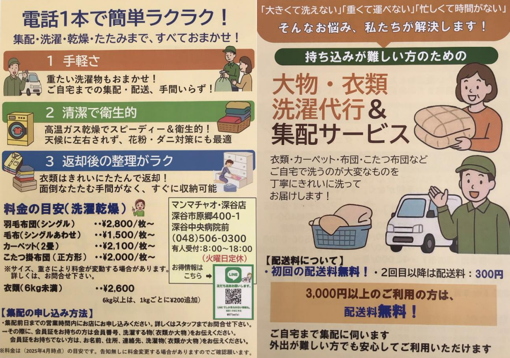 大型コインランドリーマンマチャオ・深谷店(綺麗・清潔・評判の店) 住所 埼玉県深谷市原郷400-1 営業時間 8時~19時年中無休 駐車場 備考 セルフ対応の乾燥機あり洗濯代行サービスはお電話下さい。(048)506-0100有人受付:8:00~18:00 (火曜日定休) 機 種 台 数 料 金 14kg乾燥機 1台 10分/100円