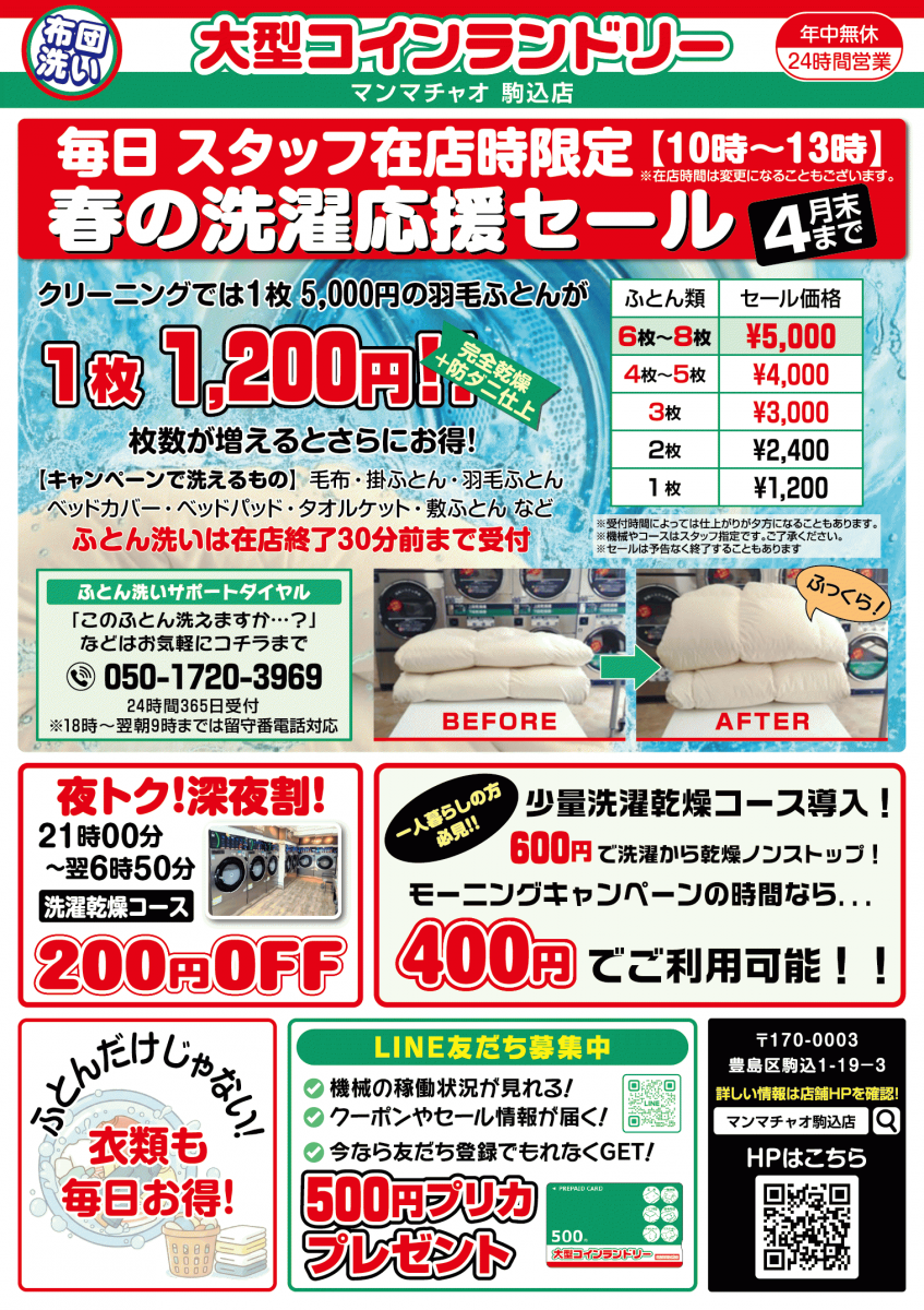 | 備考 | マンマチャオ駒込店は24時間営業のコインランドリーです。 大型の洗濯乾燥機をご用意しております。 ・24-hour self-service laundromat ・All-in-one washer & dryer 「花粉が辛くて外干しできない…」 そんな悩みはコインランドリーで解決!! 花粉除去率は脅威の99%!! ▶ 実験結果はコチラで確認 ![]() NEW! ◼️夜トク!深夜割実施中❗️ 21:00〜6:50に深夜割を実施中❗️ \洗濯乾燥コースがなんと200円引き!/ 夜の空いた時間におトクにお洗濯しませんか? ◼️機械操作が簡単で初めての方も安心!! 簡単3ステップ! 洗濯物を入れる→コースをえらぶ→支払う で最短55分!! 使い方・洗い方に不安がある方はこちらにお電話ください 📞ふとん洗いサポートダイヤル ・24時間365日いつでも何でもご相談ください。 ・ただし、平日9時~18時は通常受付、それ以外の時間は留守番電話対応になります。メッセージを残していただきましたら後日ご連絡させていただきます。 ![]() NEW!! ■ランドリーバッグレンタルサービス開始 🧺 【大容量ランドリーバッグ無料レンタル中!】 敷ふとんがすっぽり入る大容量(175L)! シングルの掛けふとんなら2枚までラクラク収納✨ 雨の日も安心のカバー付きタイプ。 おふとんの持ち込みやお持ち帰りがぐ~んと便利に☔ 📍ご利用無料! ご希望の方は、スタッフまでお気軽にお声がけください。 ![]() 【新機能のお知らせ】マンマチャオAIサポート導入!! ✅使い方がわからない時 ✅返金依頼・トラブルがあった時 ✅領収書発行をしてほしい時 などAIが丁寧に対応します。 LINE公式アカウントを友だち追加後、メニューの「問い合わせ」よりご利用可能できます! ■機械の稼働状況を確認できるようになりました! 稼働状況はコチラからご確認ください 【マンマチャオ駒込店の5つの安心😌】 ①【初めてでも安心】スタッフ在店のコインランドリー ※スタッフカレンダーの読み込みに時間がかかります 機器類の使い方などご不明点などはお気軽にスタッフにお声かけください🎵 ・毎日のお掃除と機械のメンテナンス、そして使い方やおふとん洗いのサポートをしています! ・掛けふとんや敷ふとん洗い専用ネットもご用意しています。 ・📞ふとん洗いサポートダイヤルはコチラ 24時間365日いつでもふとん洗いのことなら何でもご相談ください。 ただし、平日9時~18時は通常受付、それ以外の時間は留守番電話対応になります。メッセージを残していただきましたら後日ご連絡させていただきます。 ②【👛お財布にやさしくて安心】最新セール情報 ふとんの洗濯から完全乾燥までが1枚1,200円しかも防ダニ抗菌仕上! さらにふとんのまとめ洗いセールも実施中❗️防ダニ加工付きで 3枚持ち込むと3000円(1枚あたり1000円) 5枚持ち込むと4000円(1枚あたり800円) 8枚持ち込むと5000円(1枚あたり625円) 持ち込むほどお得に❗️ 2割もお得なプリカで支払えば1枚あたり最安実質500円!?絶対お得✨ ※まとめ洗いは機械やコースはスタッフ指定とさせていただきます。 ※まとめ洗いの受付時間は在店時間終了1時間前です。 ※セールは予告なしに終了することもあります。 3,600円分のプリペイドカードを3,000円にて販売中! 店内自販機で24時間販売中、有効期限はありません。 ⇒1,000円札のみご利用いただけます。 ③【家事の負担軽減で安心】 大量の一般衣類はもちろん、羽毛ふとんや敷ふとんなどのふとん類、ラグやカーペットなど家では洗えない大物類まで洗えます。 ・4人家族5日分の衣類の洗濯から乾燥までがワンストップ最短55分! ・しかも、干す手間と取り込む時間がはぶけて家事の時短の強い味方💪です。 ・色落ちもなく手触りふわふわの仕上がりです。 ▶ 洗えるもの一覧はコチラ ④【ダニ・花粉対策で安心】 ダニ・アレルゲンを除去+予防! ・高温乾燥で羽毛掛けふとんのダニの死滅率は100%!! ・アレルゲン除去率は80%以上! ・しかも当店では、日本アトピー協会推奨の防ダニ抗菌剤を使用しているので、ダニを寄せつけず、増殖を抑制できます。 ▶ 実験結果はコチラで確認 ⑤【エコランドリーで安心】 電解水と天然由来の洗剤と柔軟剤の使用 ・水は、すすぎ1回でもしっかり洗える電解水を使用しています。 ・洗剤や柔軟剤は天然由来の成分で配合したエコな洗剤を使っています。 ・無料で最適な容量を洗濯機に自動で投入しています。 ▶ 肌にも環境にも優しいエコランドリーについて 📢Information ■お得なLINE公式アカウント♪ お友達限定でお得なセール情報など配信いたします♪ 今なら友達登録で、500円プリペイドカード1枚プレゼント! ご来店時、スタッフにクーポン画面をお見せください。 ■QRコード決済 導入! 詳しい決済方法は店内に掲示しておりますのでご確認ください。 QRコード決済には専用のアプリをダウンロードいただく必要がございます。 事前にダウンロードいただく事でスムーズにご利用いただけます! ・iPhoneをご利用の方 ・その他 決済後、すぐに領収書発行が可能です。 スタッフ募集中 マンマチャオでは一緒に働いて